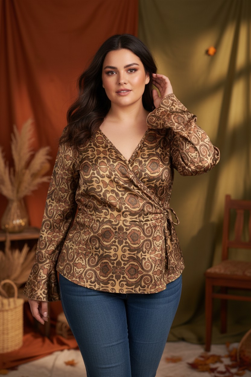 Μπλούζα κρουαζέ,σατέν,σε αποχρώσεις του μπεζ-καφέ.