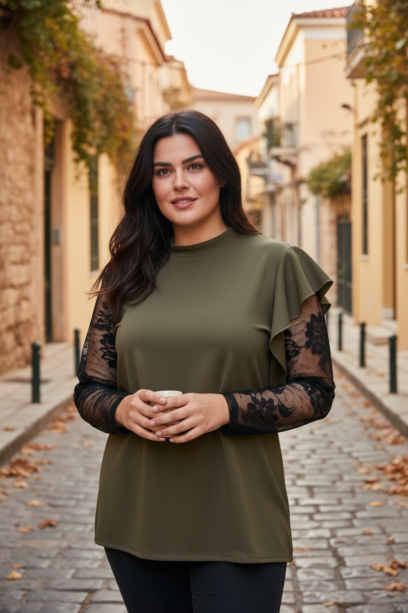 Μπλούζα με δαντέλα και μονόχρωμο ύφαμασμα σταθερό. Στη μία πλευρά έχει βολάν και πίσω κλείνει με φερμουάρ.
