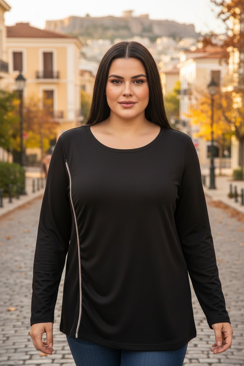 Μπλούζα μονόχρωμη, από ψηλό πλεκτό, με σούρες και στράς στο πλάι.