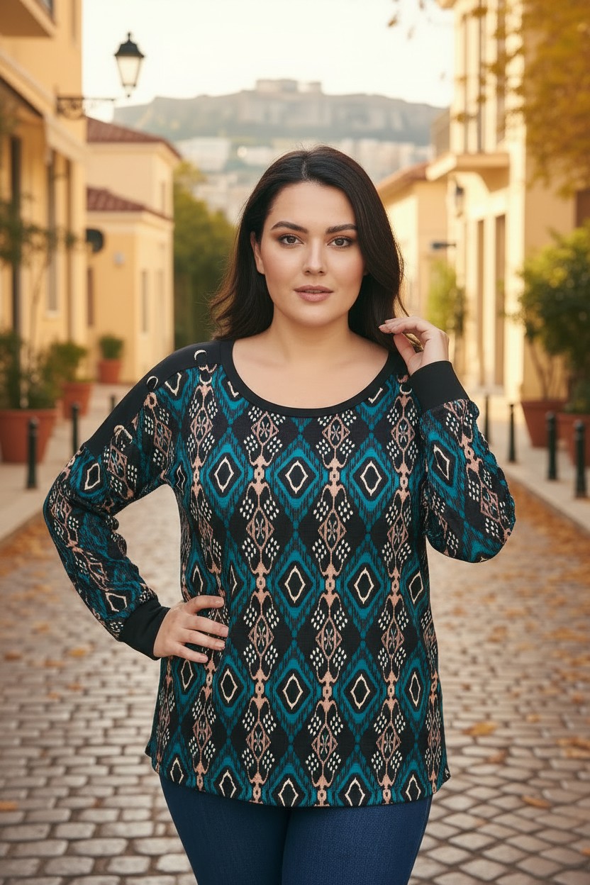 Μπλούζα εμπριμέ,πλεχτή, με διακοσμιτικά τρουκ και βελουτέ κορδέλα στους ώμους. Εύκολή και άνετη επιλογή για κάθε μέρα.