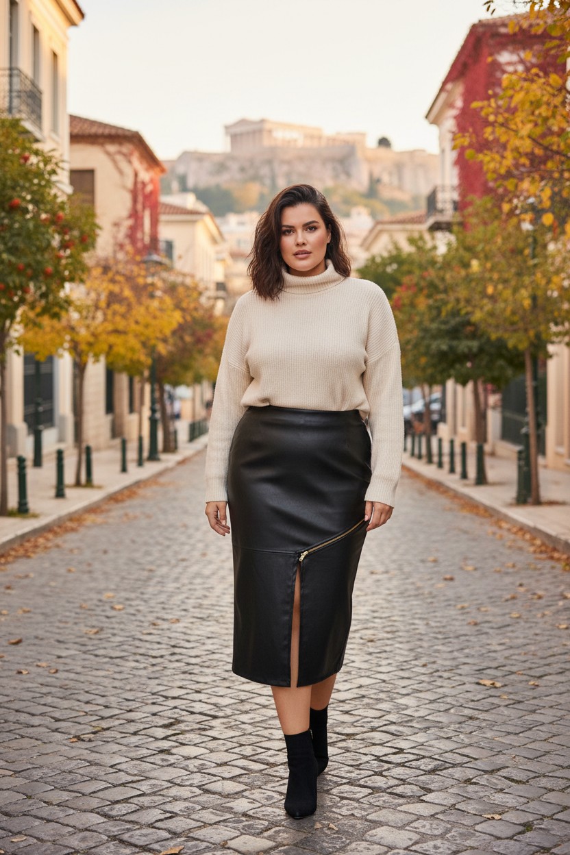 Φούστα από ελαστική δερματίνη,σε pencil γραμμή σκίσιμο μπροστά και διακοσμητικό χρυσό φερμουάρ.Μήκος midi για θυηλυκές, εντυπωσιακές εμφανίσεις.