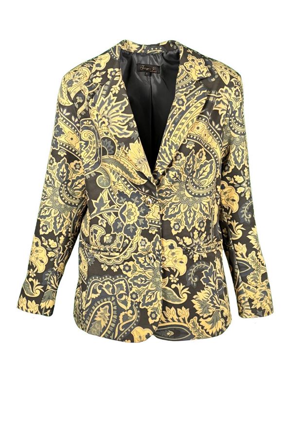 Σακάκι εμπριμέ,με χρυσές μεταλλικές λεπτομέρειες. Εϊναι μεσάτο διαθέτει τσέπες και είναι ο τέλειος συνδυασμός με το γιλέλο και το παντελόνι του.
