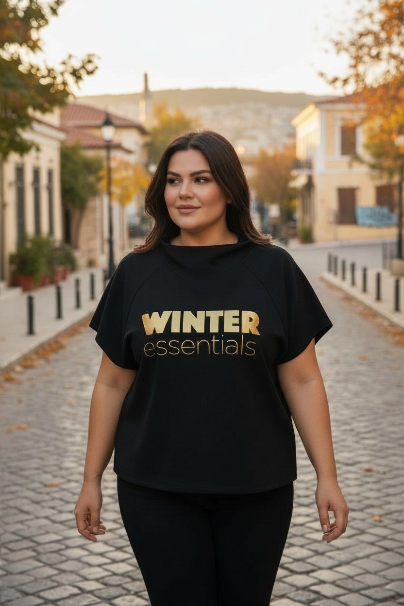 Μπλούζα σε ιδιαίτερο πατρόν, με ψηλό γιακά και χρυσό τύπωμα.