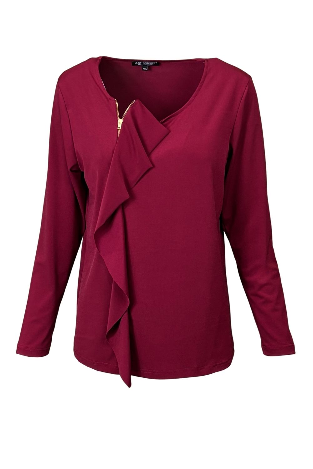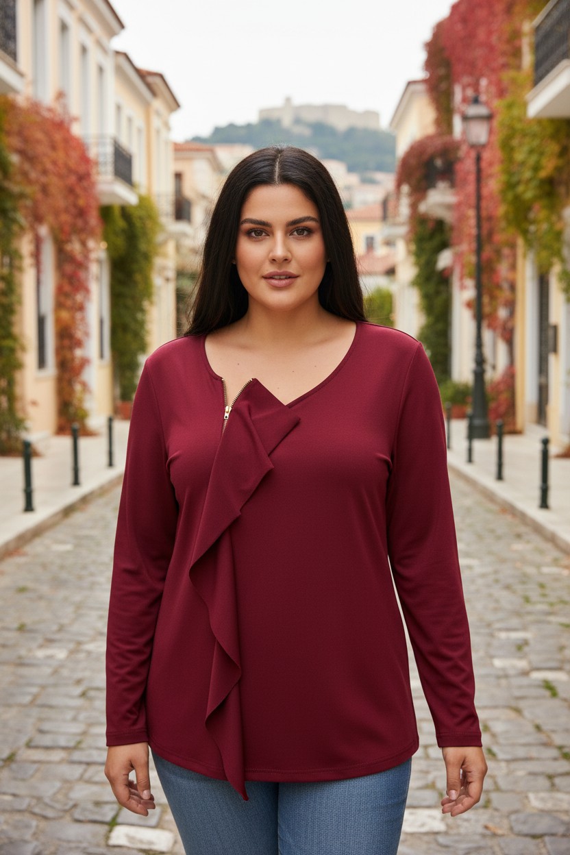 Μπλούζα μονόχρωμη με βολάν μπροστά και φερμουάρ χρυσό,σε σούπερ ζέρσυ ύφασμα.