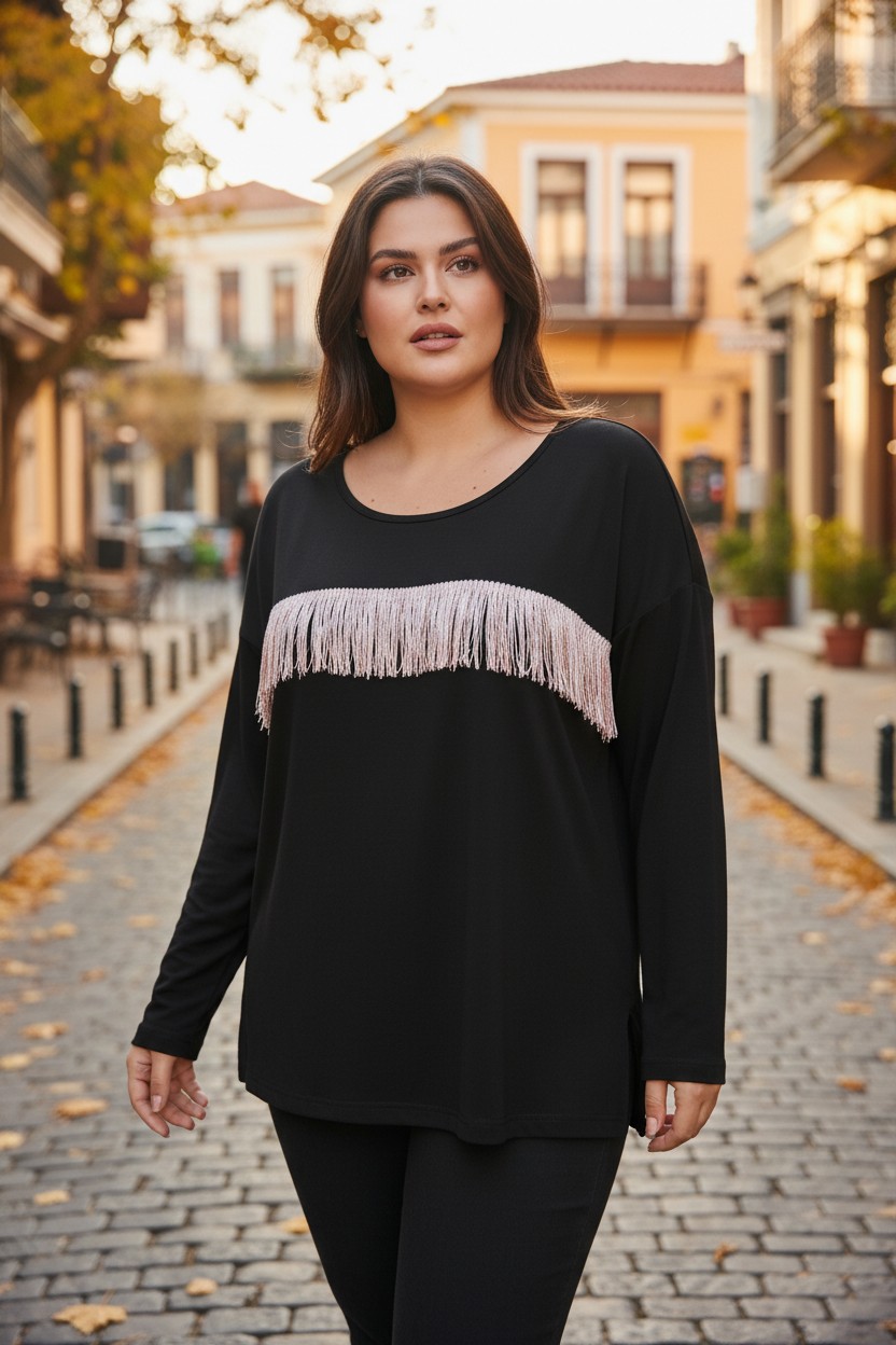 Μπλούζα από σούπερ ζέρσυ ύφασμα, με κρόσι μπροστά και λαιμόκοψη.
