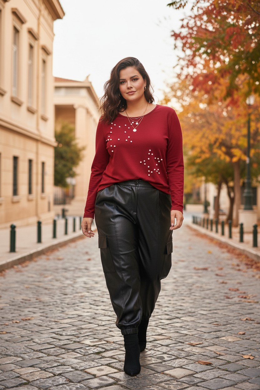 Baggy παντελόνι δερματίνη, με πλαϊνές τσέπες,πιέτες και κλείσιμο με κουμπί στον αστράγαλο. Μια ιδιαίτερη χειμωνιάτικη επιλογή.
