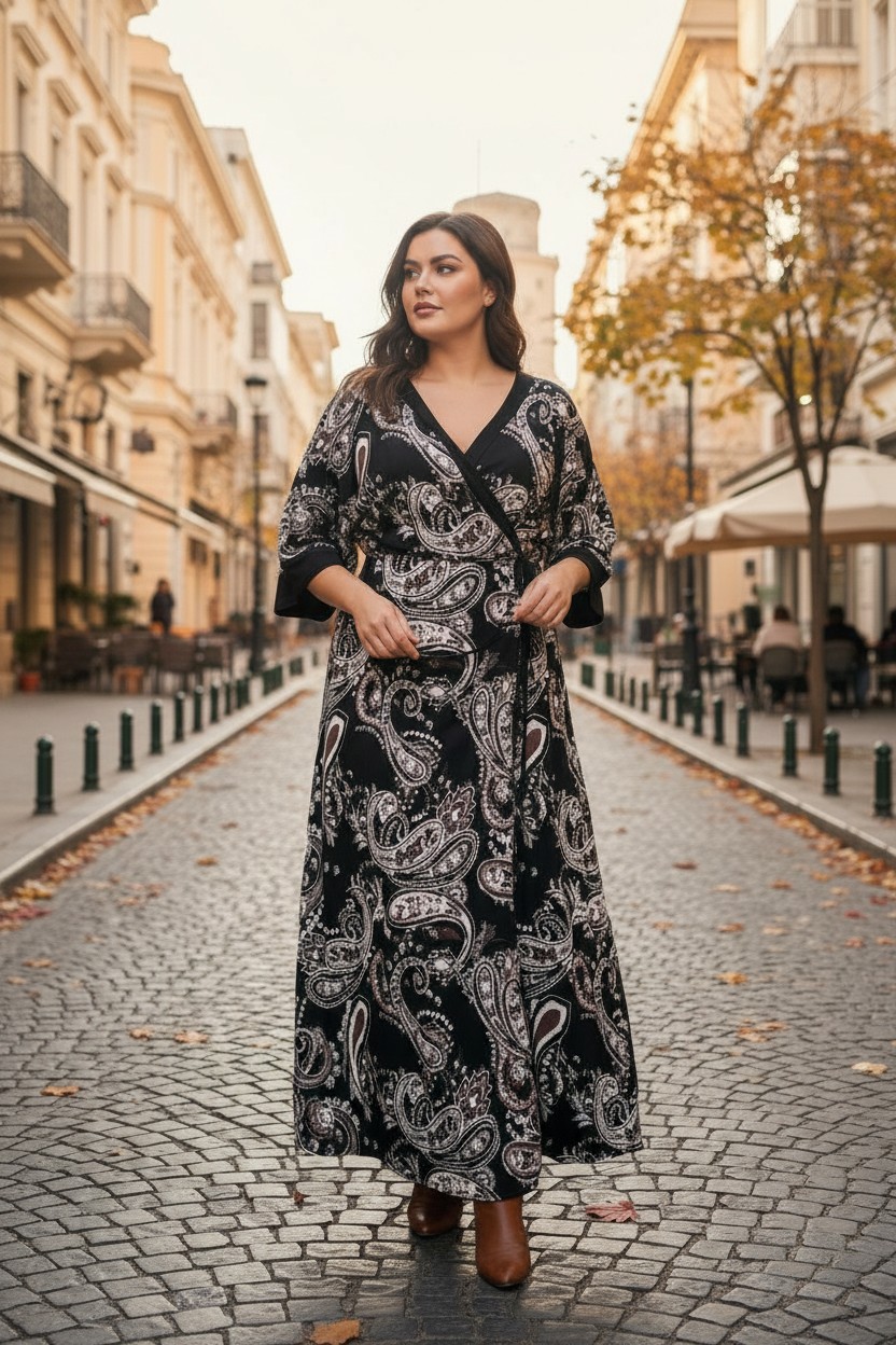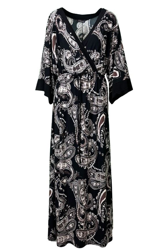 Φόρεμα μάξι,εμπριμέ,με κρουαζέ μπούστο και κορδόνι κάτω απο το στήθος που σουρώνει,σμιλεύοντας τη μέση.
